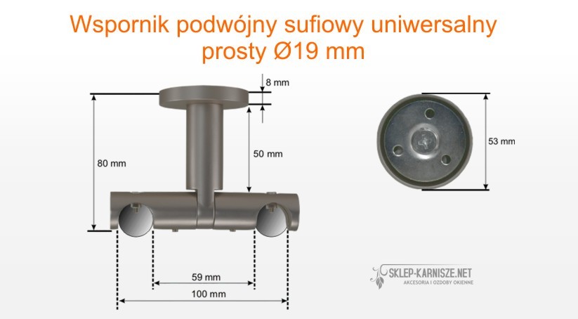 Wspornik uniwersalny przeznaczony zarówno dla karniszy przesuwnych jak i klasycznych rurowych w kolorze mosiądzu antycznego posiada stabilny system montażu na trzy kołki rozporowe. Wykonany w całości z metalu pokrytego powłoką galwaniczną oraz warstwą lakieru zwiekszającą odporność na ścieranie. Po zamontowaniu wspornika sufitowego odległość wspornika od sufitu wynosi 5,8 cm, natomiast długość całkowita wspornika wynosi 8 cm. Do każdego zestawu dodajemy wkręty i kołki montażowe gratis.